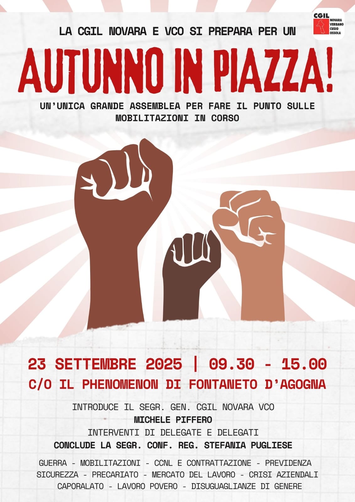 CGIL AL PHENOMENON: AUTUNNO IN PIAZZA – ASSEMBLEA DELLE ASSEMBLEE Oltre 400 presenze all’iniziativa tenutasi il 23 settembre al Phenomenon di Fontaneto, organizzata dalla CGIL Novara VCO per fare il punto sulla mobilitazione in corso che dura incessantemente da oltre due anni.Gli interventi si sono concentrati sull’importanza che le sfide
