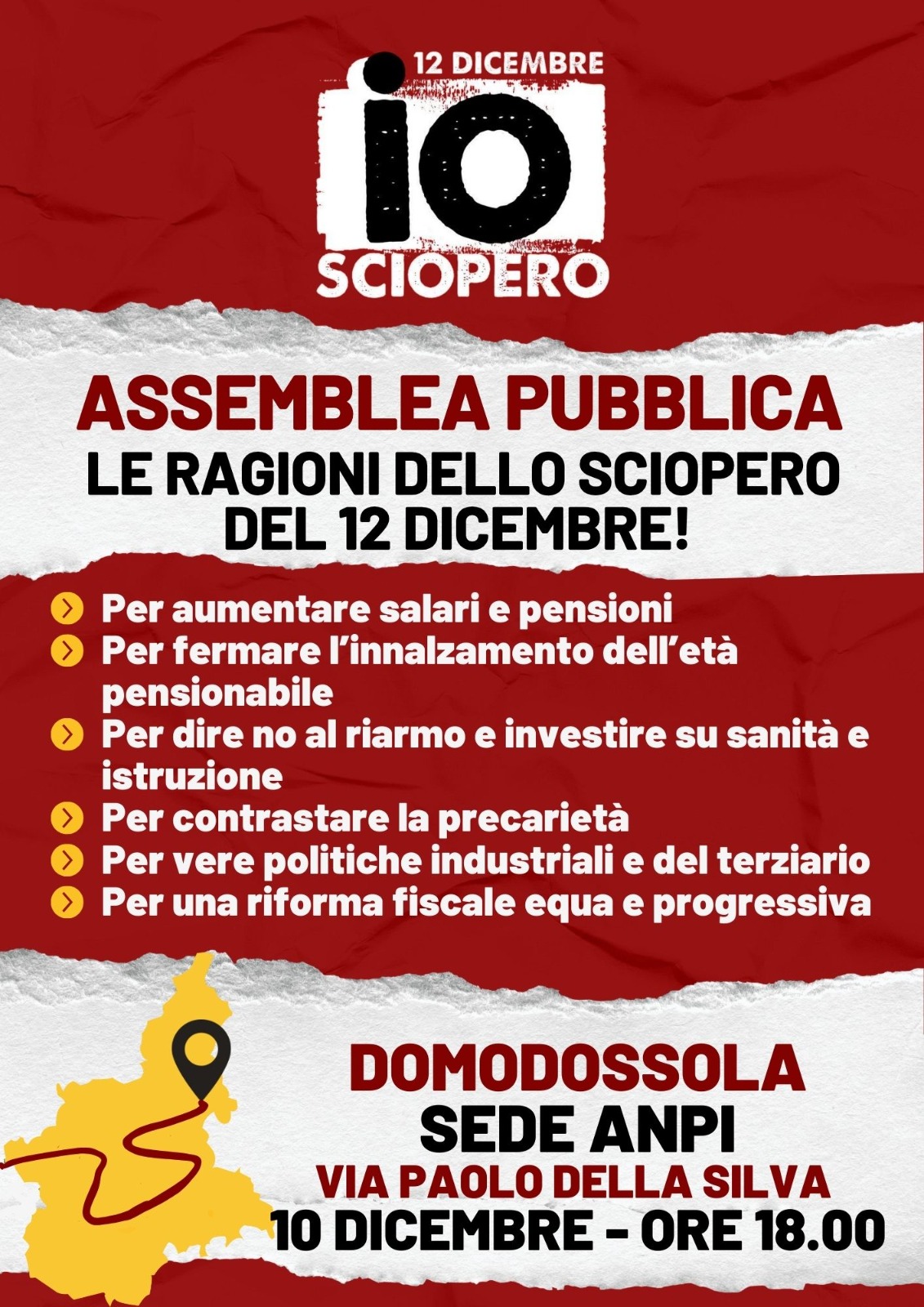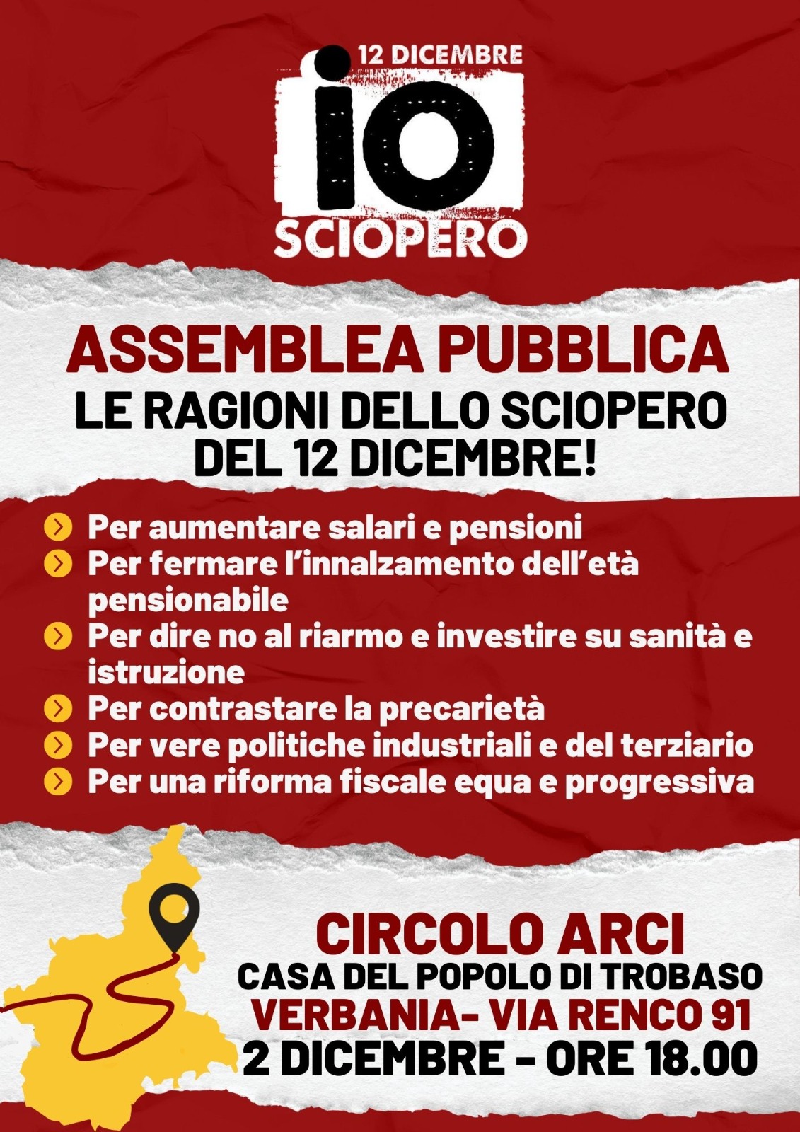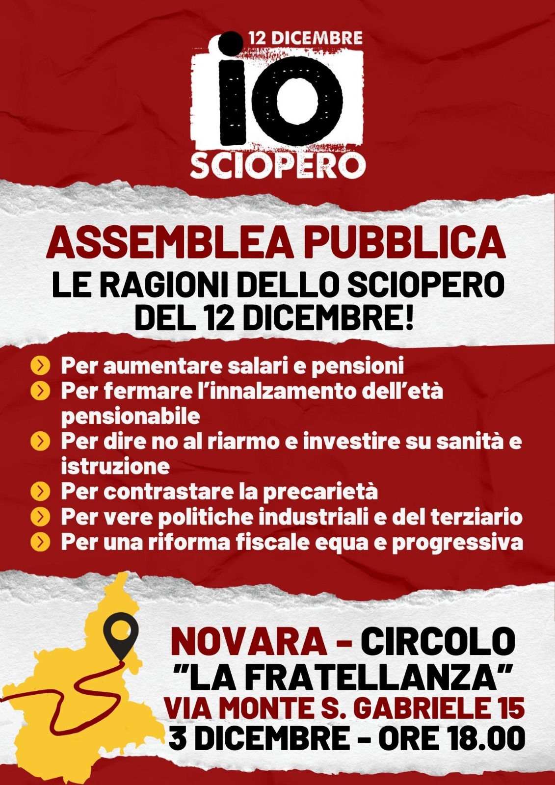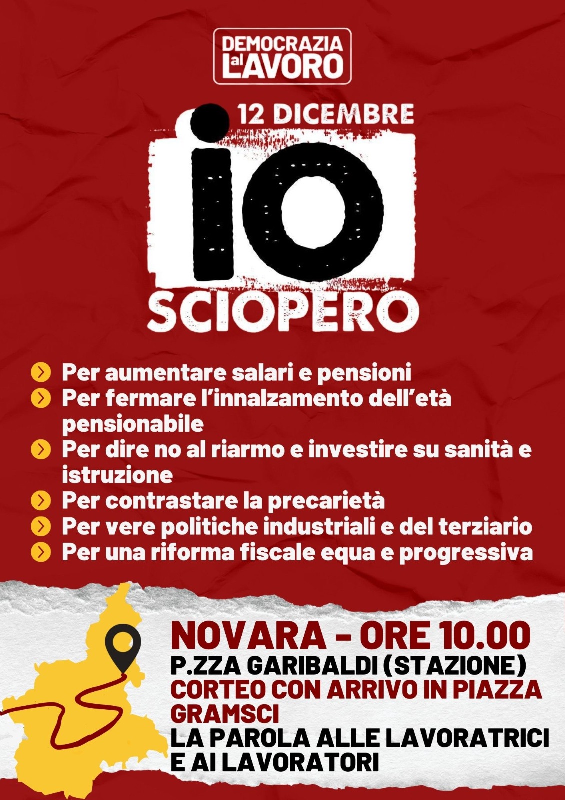 Non può esserci una democrazia autentica se la democrazia non esiste anche nei luoghi di lavoro. Anche per questi motivi sciopereremo il 12 dicembre. Per le provincie di Novara e del Vco l'appuntamento in piazza è alle ore 10 di fronte alla stazione ferroviaria di Novara.